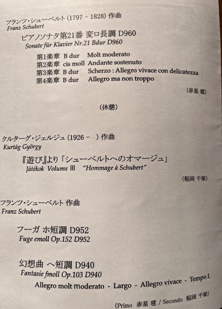 赤星さんが長く温めてきたシューベルトの最後の❝ピアノソナタ第21番 変ロ長調 D960❞で始まり、私も客席で聴かせていただきました。彼女の歩みを感じる演奏で、今回の後半プログラムの連弾二曲にも通ずることも感じながら拝聴。